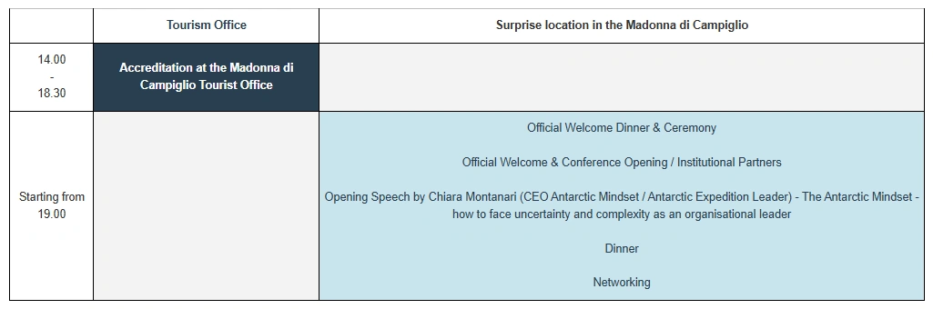| Starting from 19.00 | Official Welcome Dinner & Ceremony Official Welcome & Conference Opening / Institutional Partners Opening Speech by Chiara Montanari (CEO Antarctic Mindset / Antarctic Expedition Leader) - The Antarctic Mindset - how to face uncertainty and complexity as an organisational leader Dinner Networking |