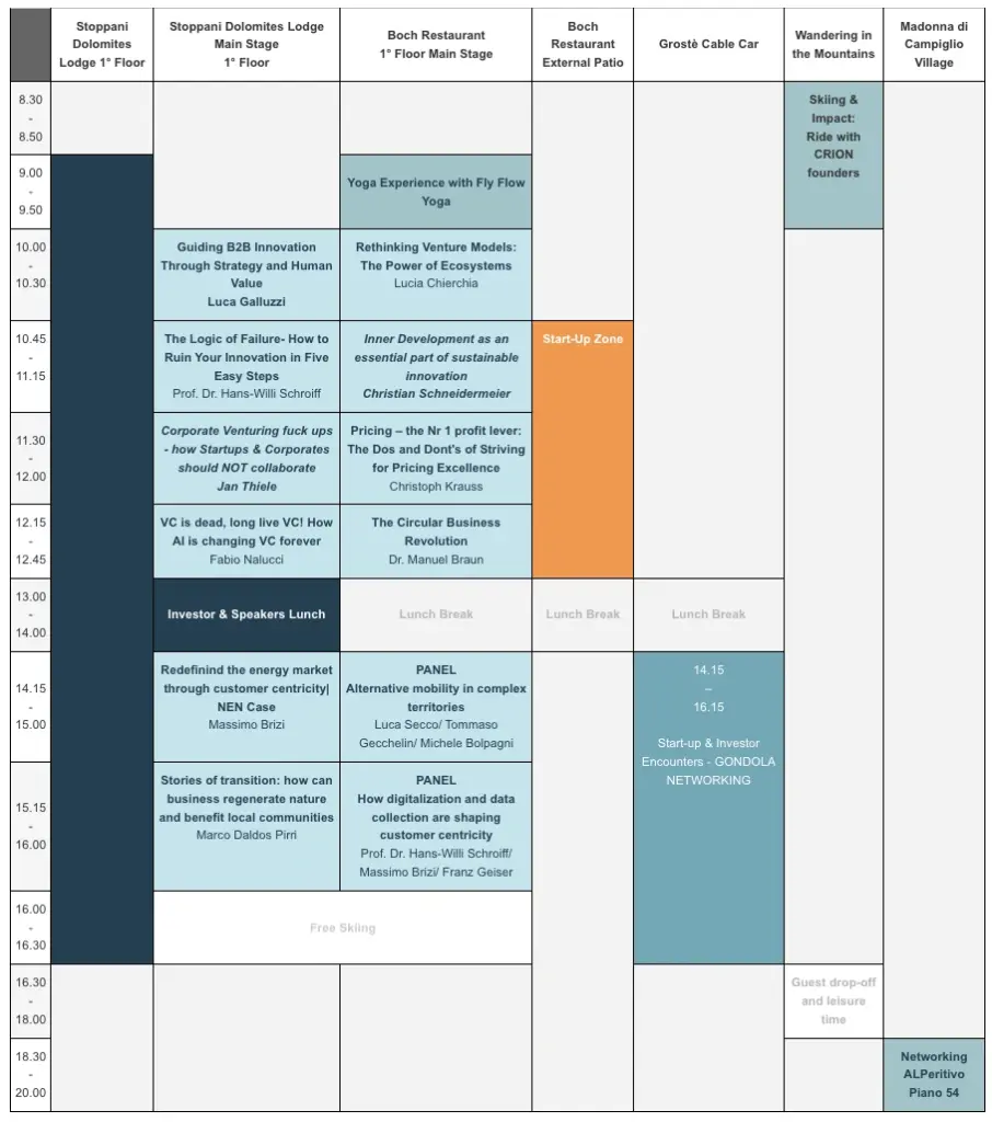 During our Gondola Networking session, participating start-ups will have the unique opportunity to meet investors one-on-one during a scenic gondola ride. It’s your moment to present your vision, answer key questions, and spark meaningful conversations in an unforgettable setting. This ride isn’t just about altitude, it’s about impact. Use the time to leave a lasting impression that could shape your next investment opportunity.