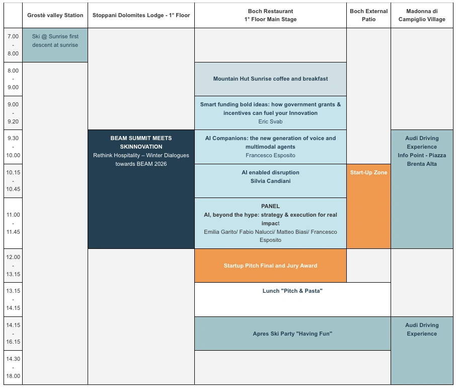 Join us on Thursday at 18:30 at Piano 54 for Networking ALPeritivo, an evening of good vibes, tasty bites, and great conversations. Enjoy a selection of aperitivo snacks and a sparkling glass of Ferrari Spumante thanks to our partner (don’t forget to bring your drink voucher from the accreditation package!). It’s the perfect setting to meet fellow participants, exchange ideas, and toast to innovation in the heart of the Alps.